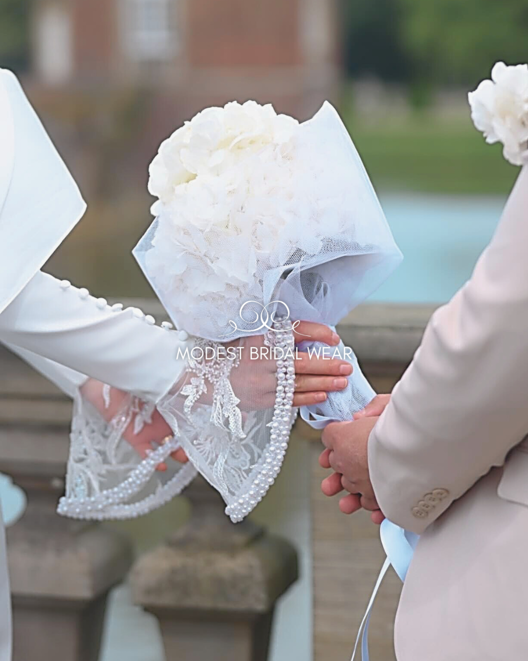 AHLAM, a stunning modest wedding dress for the modern bride seeking elegance and modesty. This dress features flare lace sleeves delicately embroidered with beads and pearls, adding a touch of glamour to the overall design. The dress also includes a short attached cape, providing a modest yet fashionable look. Additionally, a long cape gracefully drapes down the back, creating a captivating and ethereal effect. With its combination of intricate details and modest design, the AHLAM wedding dress is perfect for those seeking a timeless and refined modest bridal look.