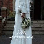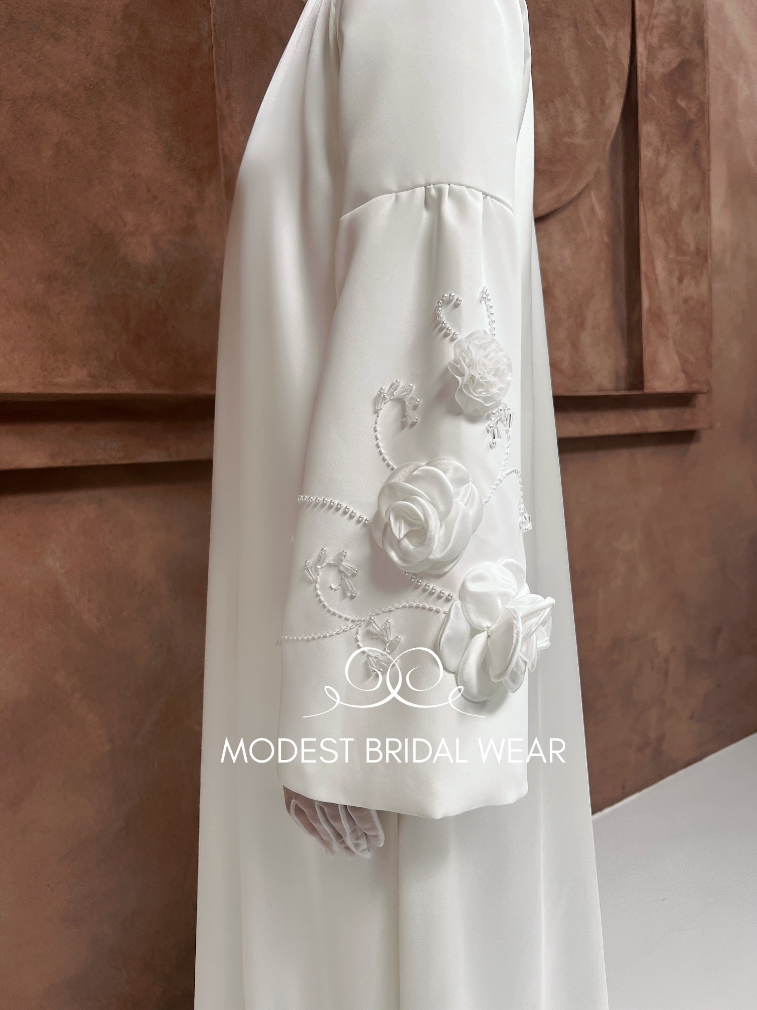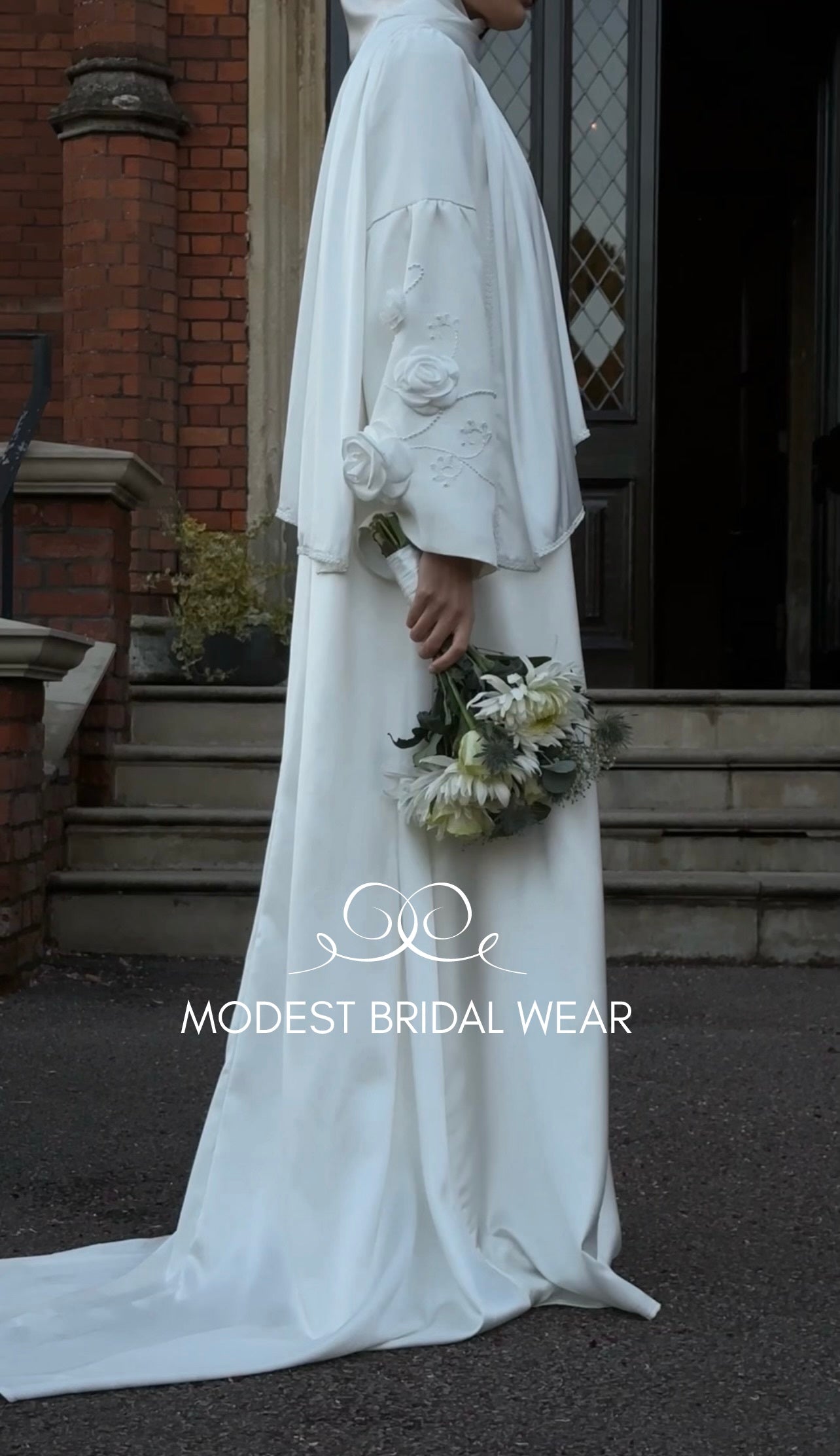 Modest bridal dress Amber is the ultimate choice for the bride who wants to feel confident and comfortable on her special day. The modest, relaxed, flowing fit allows you to move with ease, while the luxurious satin fabric and feminine floral accents create a look that is both timeless and on-trend.
