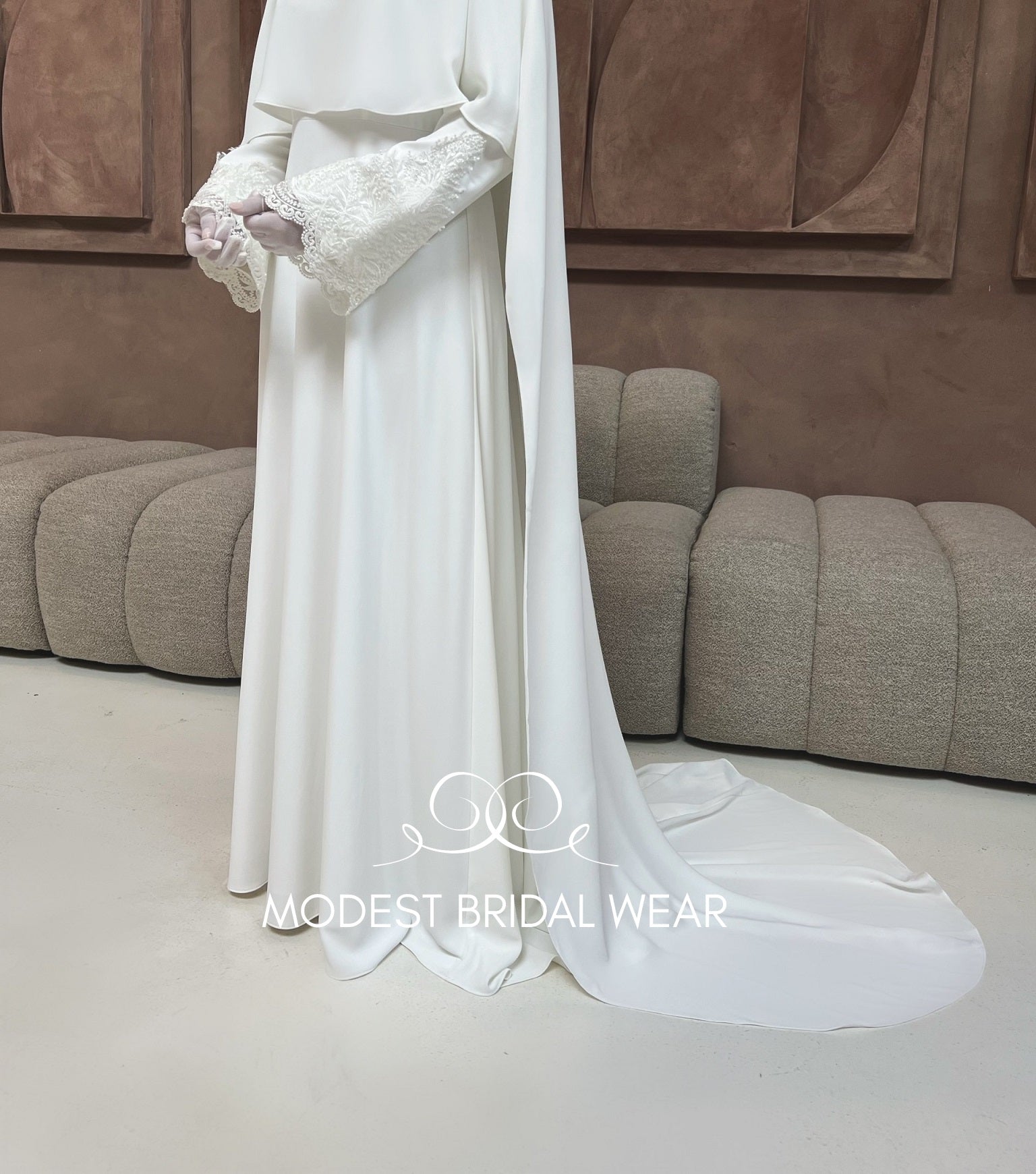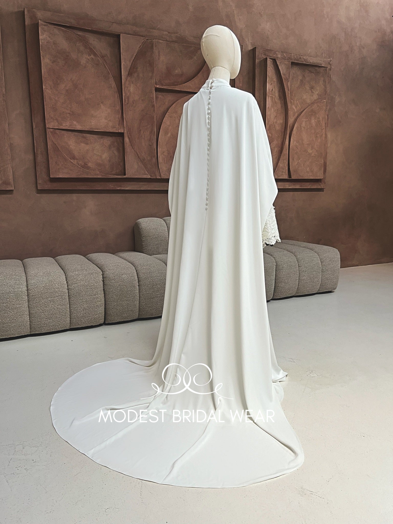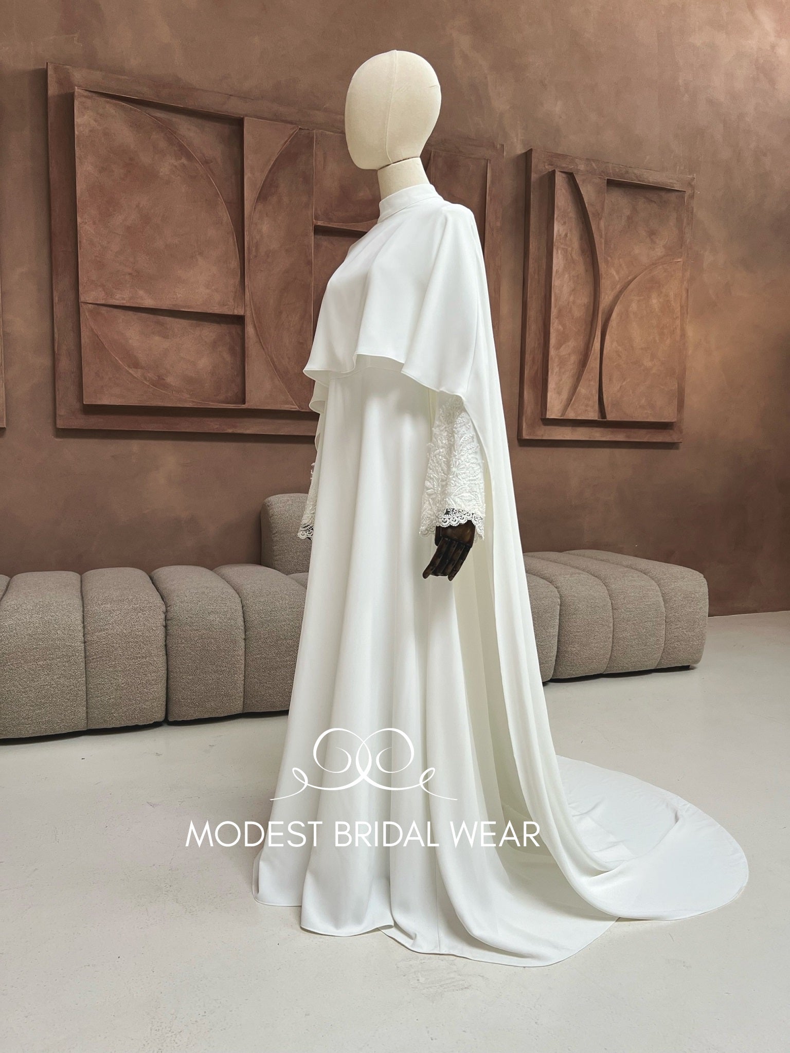Timeless elegance meets modern modesty in the Dress HAYA with attached cape for modest coverage. This breathtaking bridal gown features a flowing crepe fabric, wide sleeves with delicate lace accents, and an attached cape for the ultimate in modest, sophisticated style.